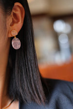 Zarte Rosenquarz Ohrringe mit facettierten Kristallen fangen romantische Lichtspiele ein. Die goldene Vermeil Nadel und der Rahmen setzen einen luxuriösen Kontrast zu den sanften Rosatönen. Größe 3 x 1 cm, dezente Raffinesse und Liebesymbol. Perfekt als Geschenk oder für sich selbst.