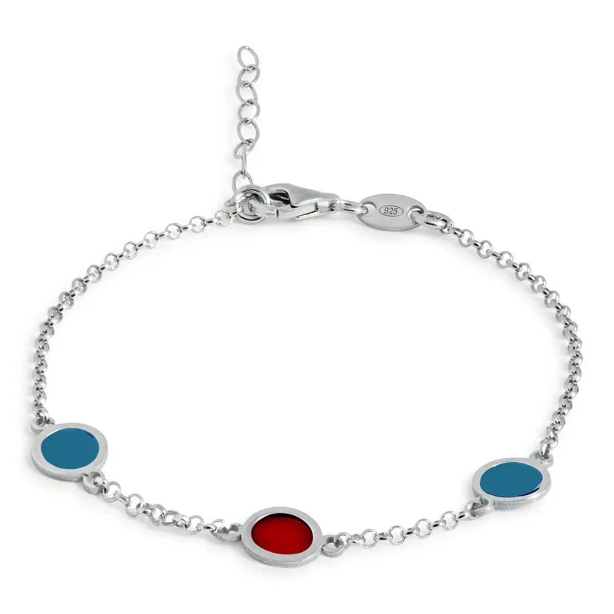Feines Kettenarmband mit 3 Silberkreisen mit durchscheinendem Kristall in Granat- und Dunkeltürkisfarbe.