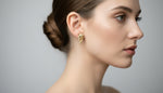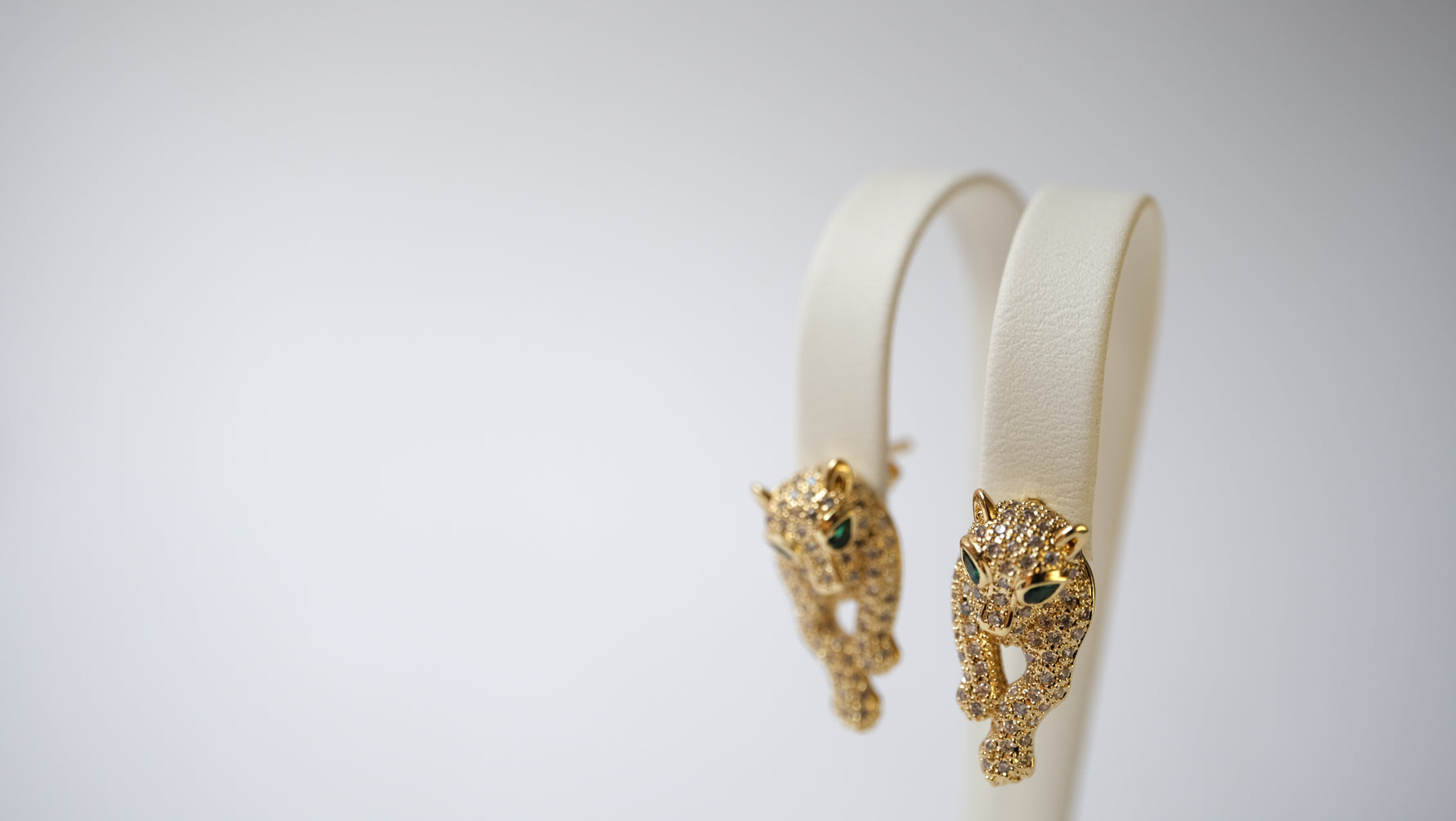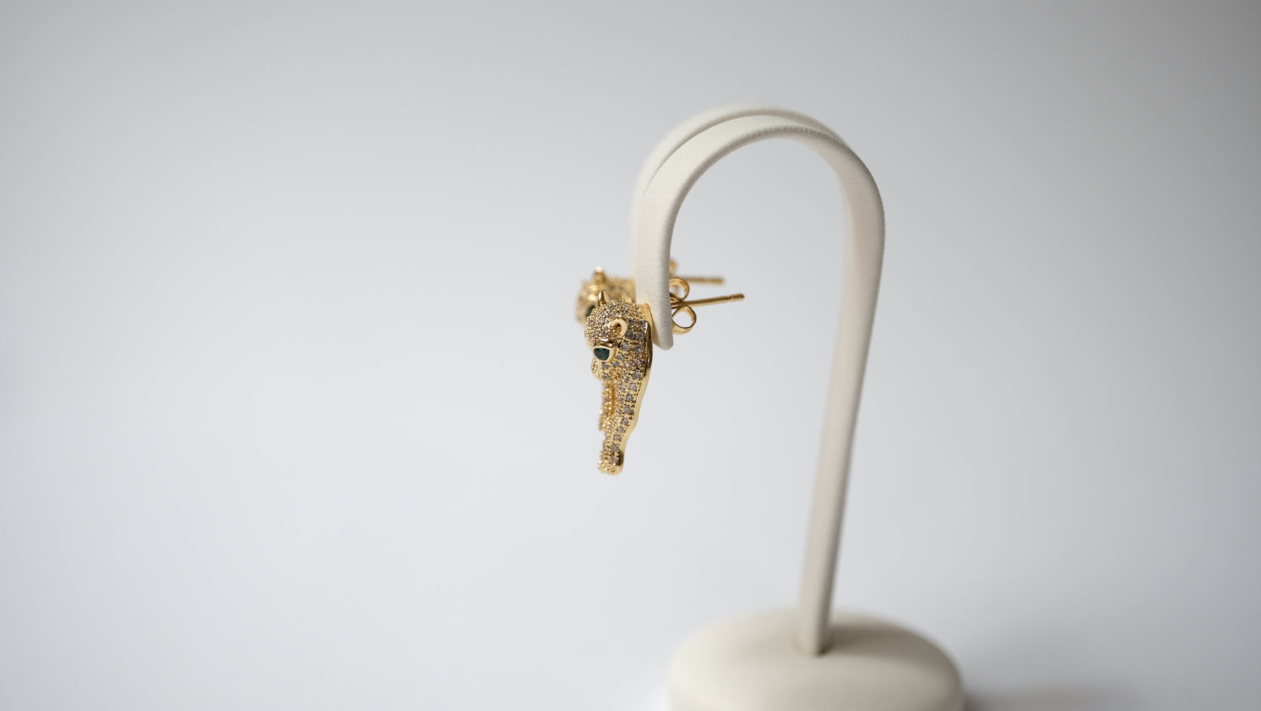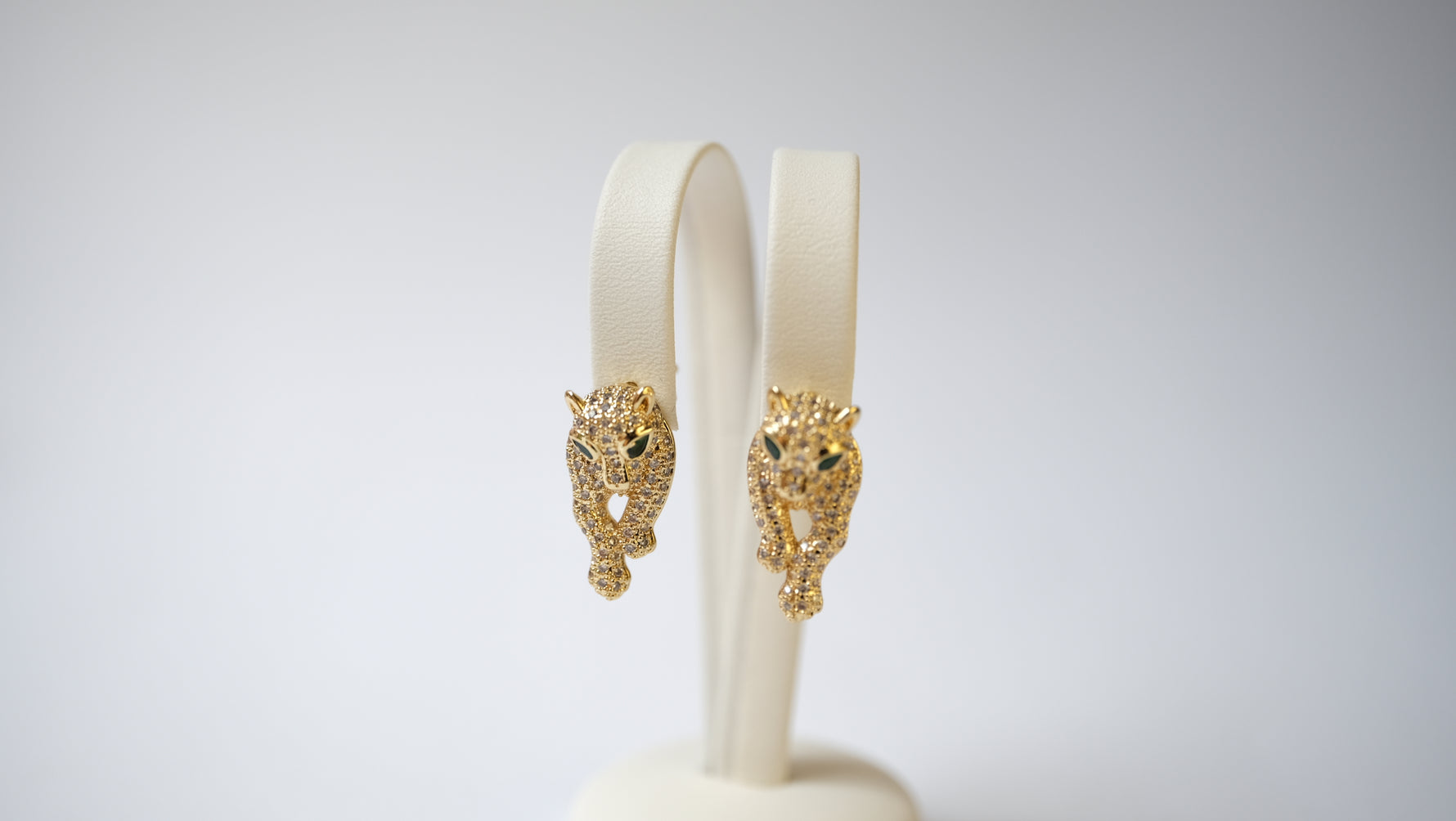 Leopardenohrringe mit Kristall und grünem Zirkonia. Eleganter Schmuck aus 18 Karat vergoldetem Material, kombiniert mit Kristall und grünem Zirkonia.